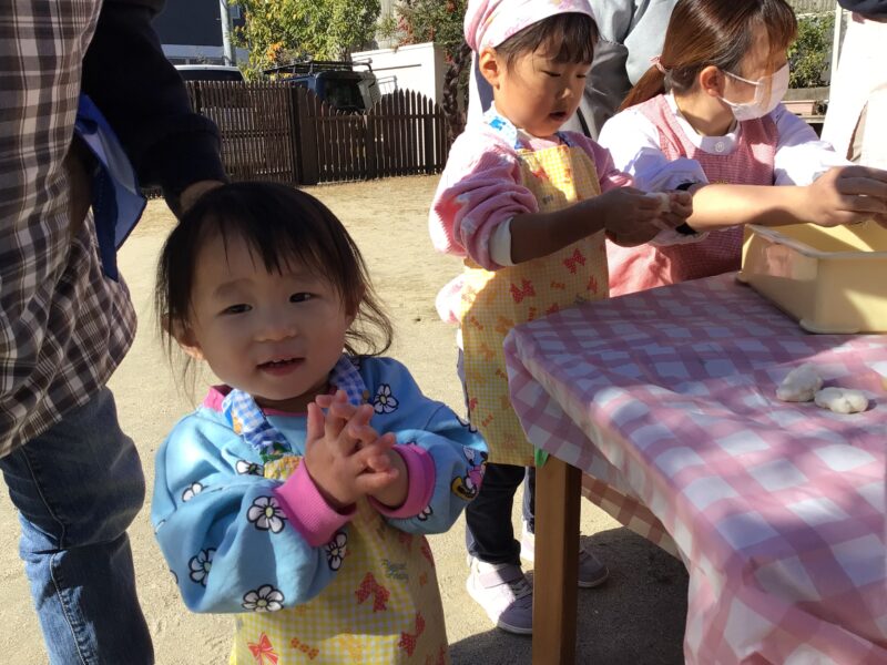 初めての「もちつき大会」では、大好きなおばあちゃんと一緒に「よいしょ!よいしょ!」と掛け声をかけながら、おもちつきを楽しみました。次は、丸めてコネコネ〜。年末の楽しいひとときでした。