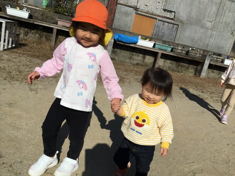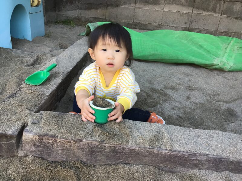 お天気に恵まれた日は、みんなが大好きな園庭あそびに繰り出します。砂場ではカップケーキを作ることに集中しています。園庭あそびを通じて、今では『砂は口に入れてはいけない』ことも分かってきました。お友だちが手を引いて歩いてくれる中で、思いやりに触れる経験もしています。