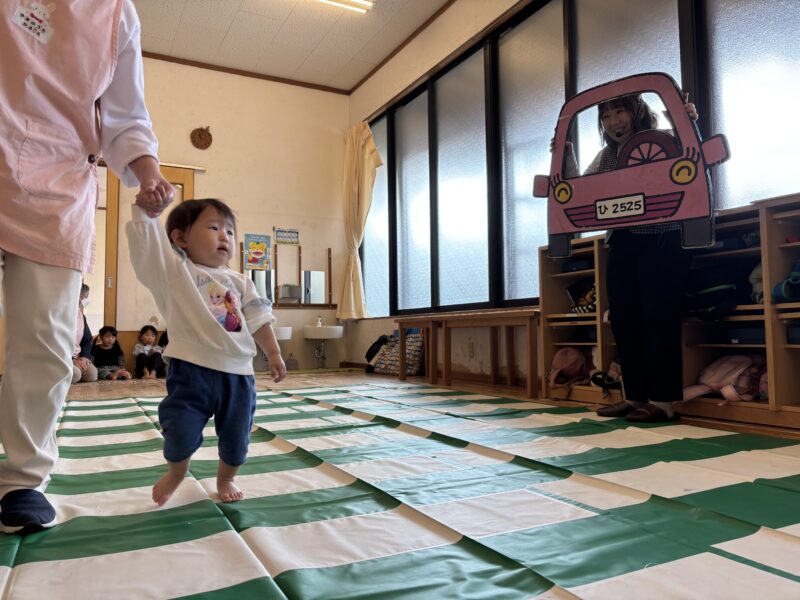 れもん組・かりん組さんと一緒に、交通安全教室に参加しました。ごあいさつに来たこうちゃん(腹話術人形)にはびっくりしましたが、最後は横断歩道も上手に渡れましたよ。