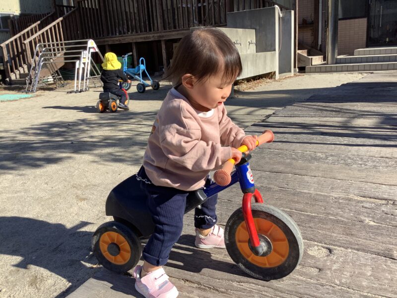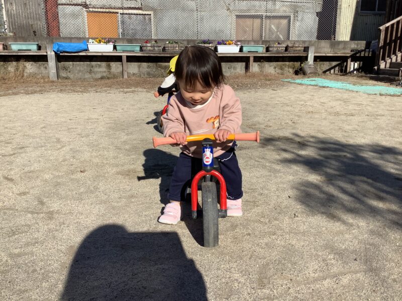 新年最初の園庭あそびでは、ちびっこライダーになって、元気にバイクをこぎ回りました。以前はバイクにまたがるのも、転んだりしてひと苦労でしたが、失敗しながら何度も繰り返し挑戦し、上手に乗れるようになりました。