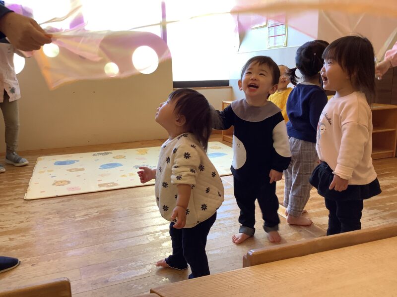 子どもたちの頭の上で大きく揺れる布は、不思議な世界観があり、笑顔いっぱいでした。お手玉