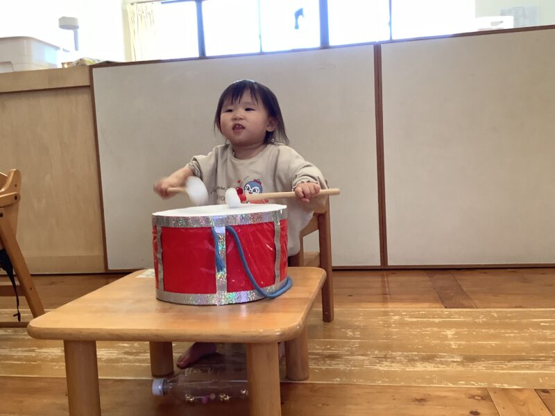 楽しみな行事が続く2月。豆まき用の箱にシールをペタペタ貼って飾り付けをしたり、発表会の練習で太鼓をたたいてみたりして楽しみました。初めての太鼓では、バチの使い方を教えると、1人で上手に「ドンドコ、ドンドコ」と音を出し、その音を楽しんでいました。
