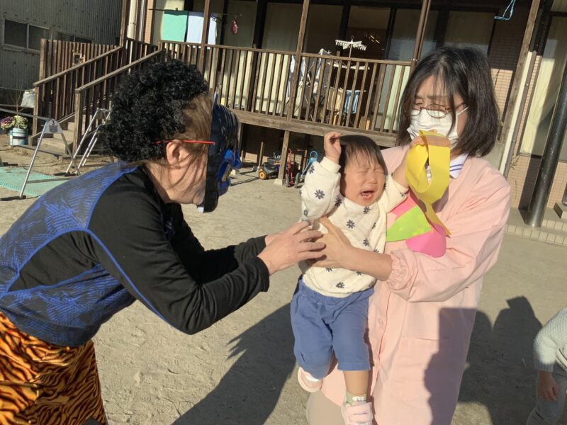 製作した「鬼のかぶりもの」と「豆入れ」を準備してスタンバイ。鬼と対面すると、子どもたちはびっくり!園庭に響き渡る元気な声に、鬼は逃げていきました。