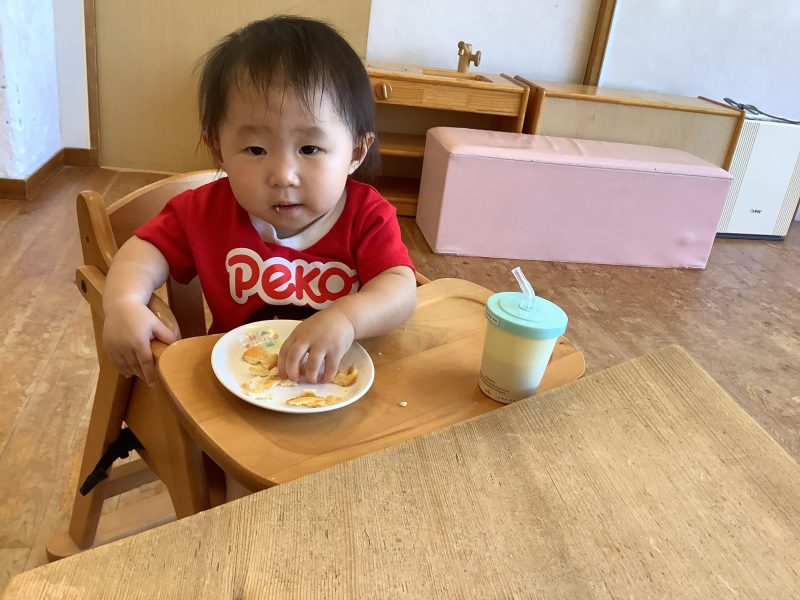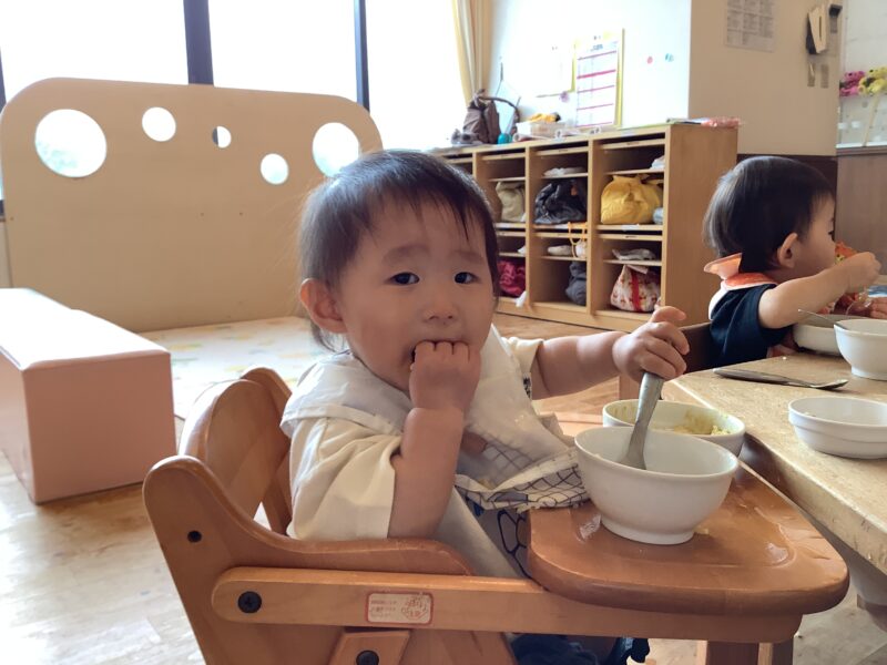 給食やおやつの時間は、子どもたちが楽しみにしているひとときです。手づかみで確かめながら、初めての食材に触れて『食』を楽しんでいます。