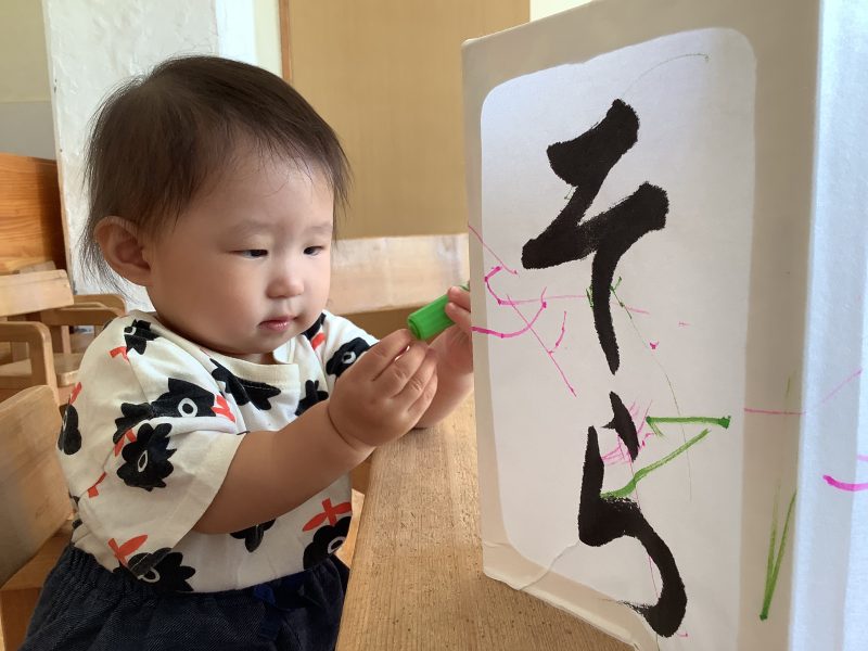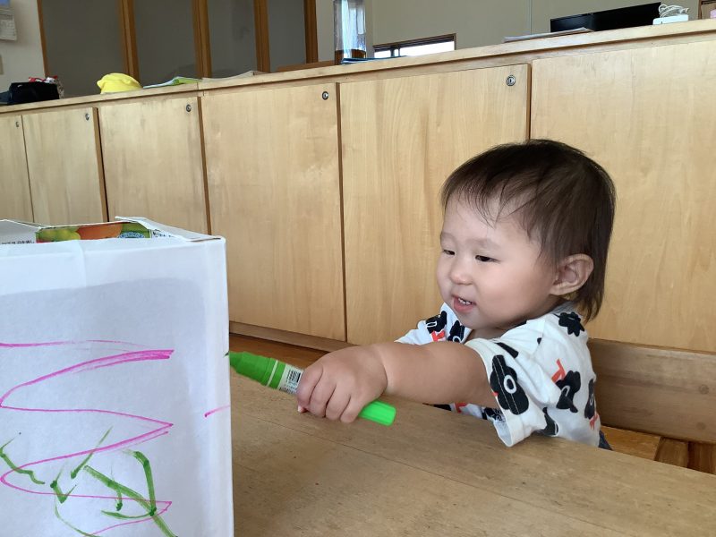 初めての夕涼み会。前日には灯籠にサインペンで色をつけて楽しみました。線が描かれていく様子を、不思議そうに見つめる姿が印象的でした。