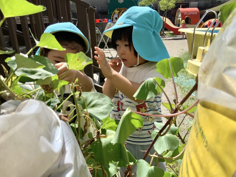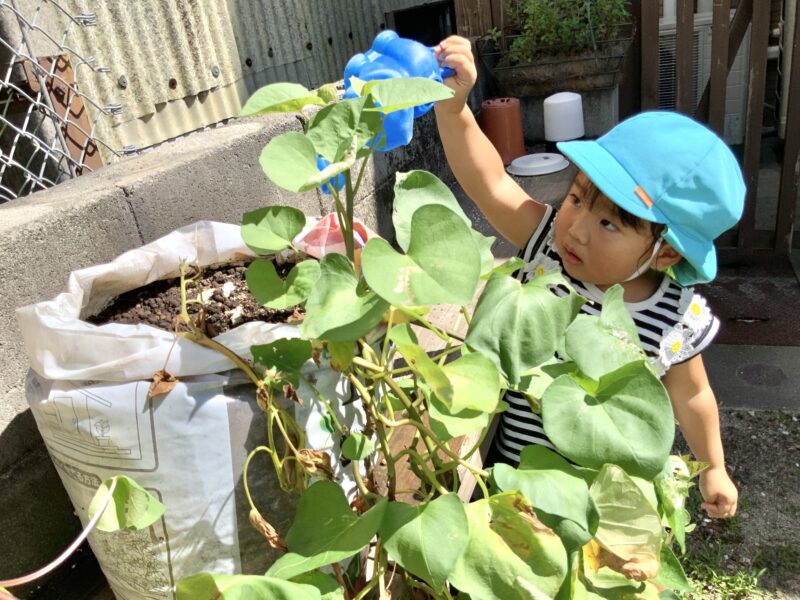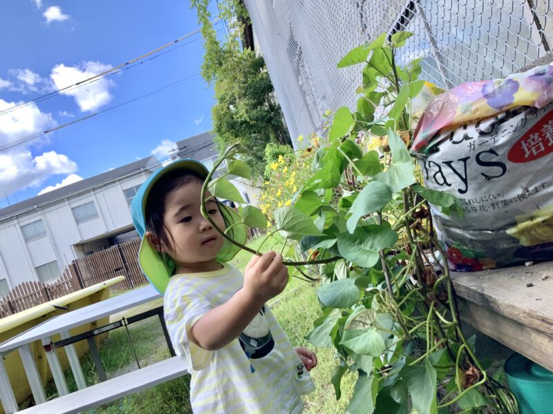 子どもたちは水やりや草取りなど、野菜のお世話をしています。「葉っぱが大きくなってる!」と、日々の変化に気づきその成長を一緒に喜んでいます。
