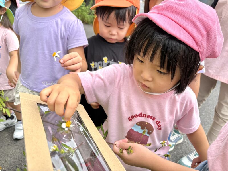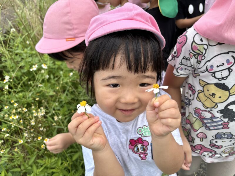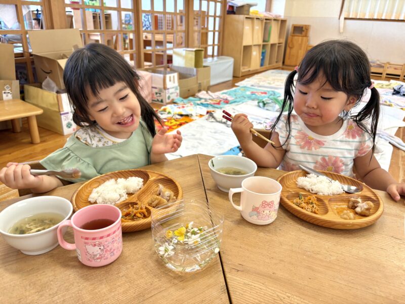 散歩の途中で見つけた秋の花を摘み、水を張った小皿に飾りました。「きれいね」と嬉しそうに眺めながら、楽しく給食の時間を過ごしていました。