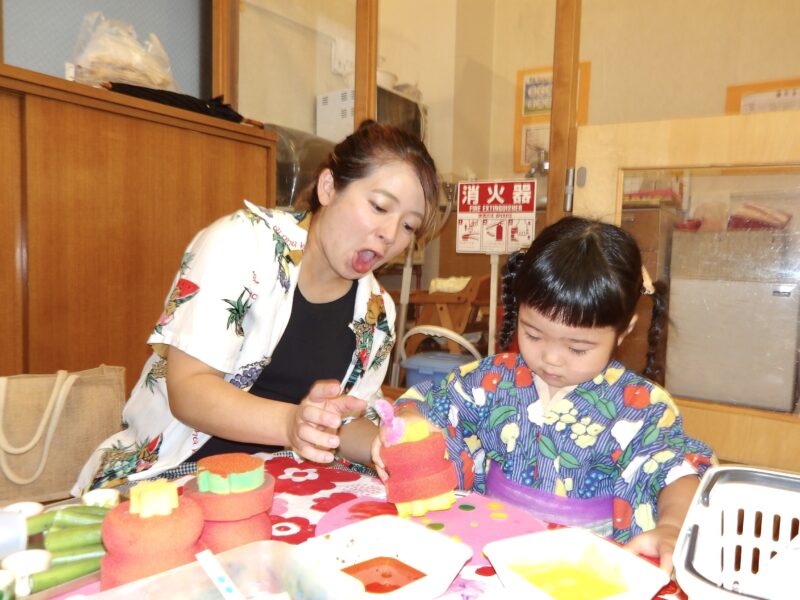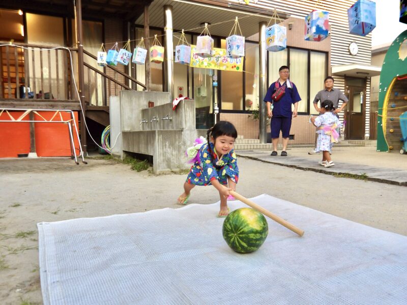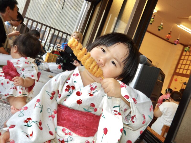 夏の夕暮れに行われた夕涼み会。子どもたちは水風船で遊んだり、家族と一緒に食事を楽しんだりして大はしゃぎでした。