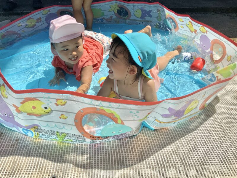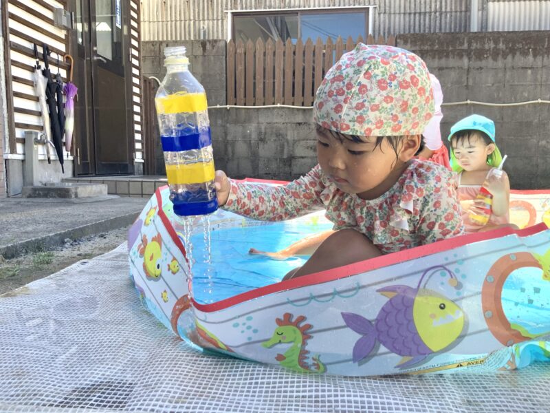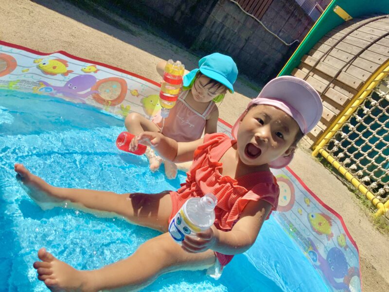 青空の下、子どもたちは水の感触を存分に味わいながら、元気いっぱい!プールでは、ペットボトルシャワーやワニ歩きなど、夏ならではの遊びを満喫しています。