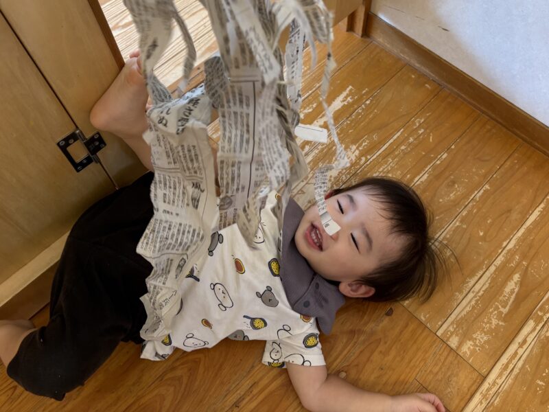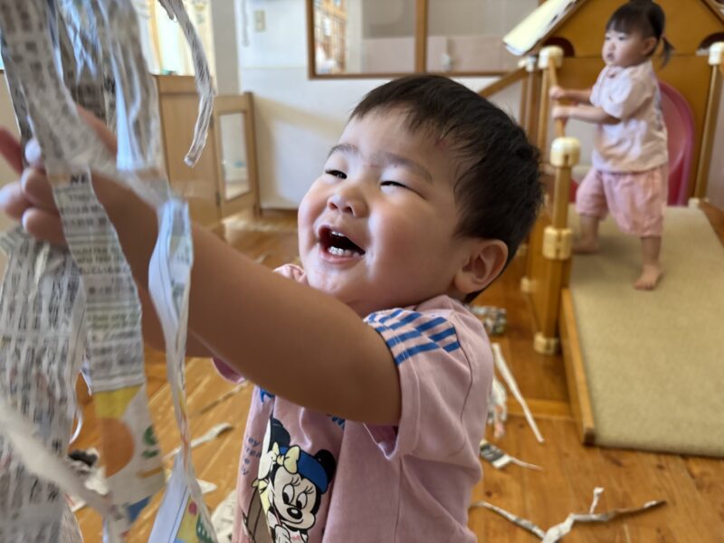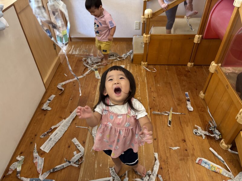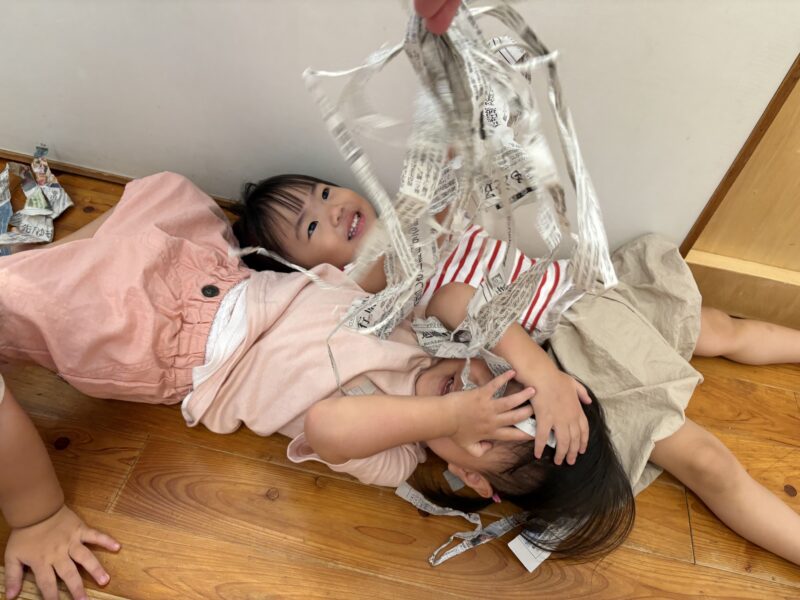 新聞紙をびりびりと破いて、雨のように降らせてみました。子どもたちは大喜びで「もっともっと!」と遊びを続けたがっていました。