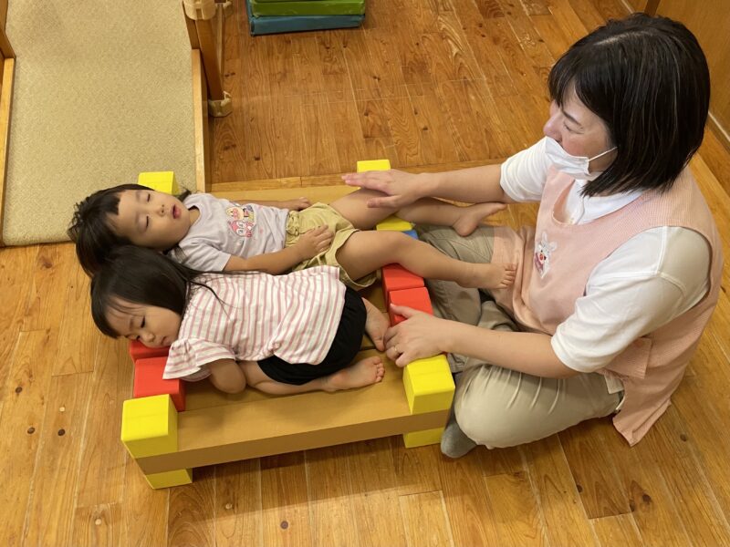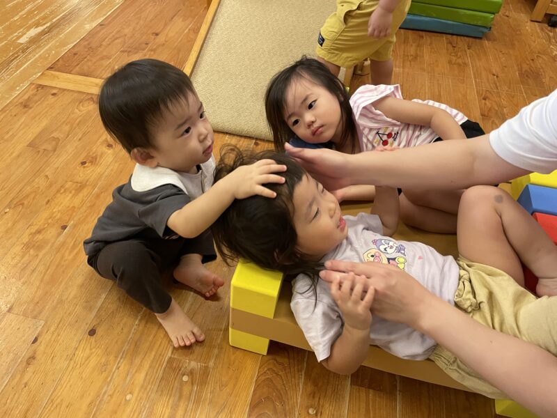 子どもたちの発想は豊かで、平均台の並べ方を工夫しながら遊んでいます。初めは橋のように渡っていましたが、次第に座ったり寝転んだりして、小さなベッドに見立てる姿も見られました。