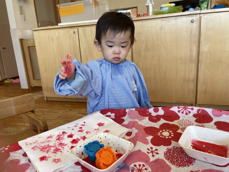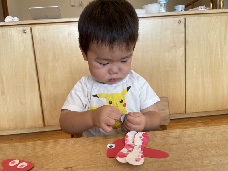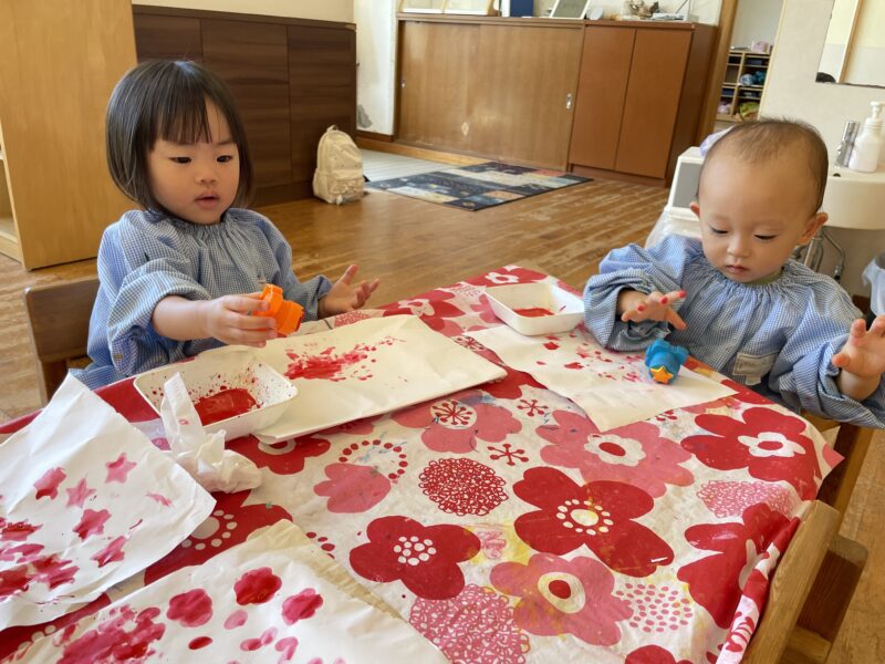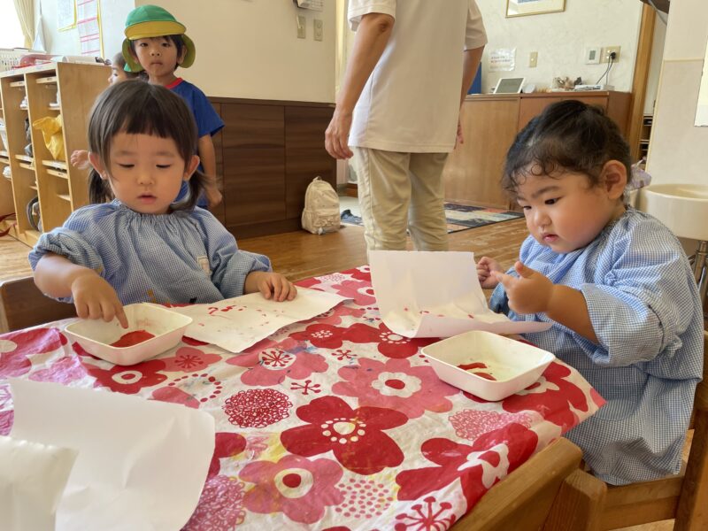 絵の具に触れることをためらっていた子どもたちも、今ではペタペタとスタンプすることを楽しんでいます。赤色でスタンプした紙は、赤とんぼの羽に変身しました。