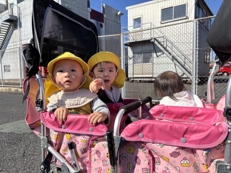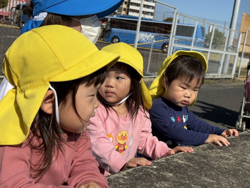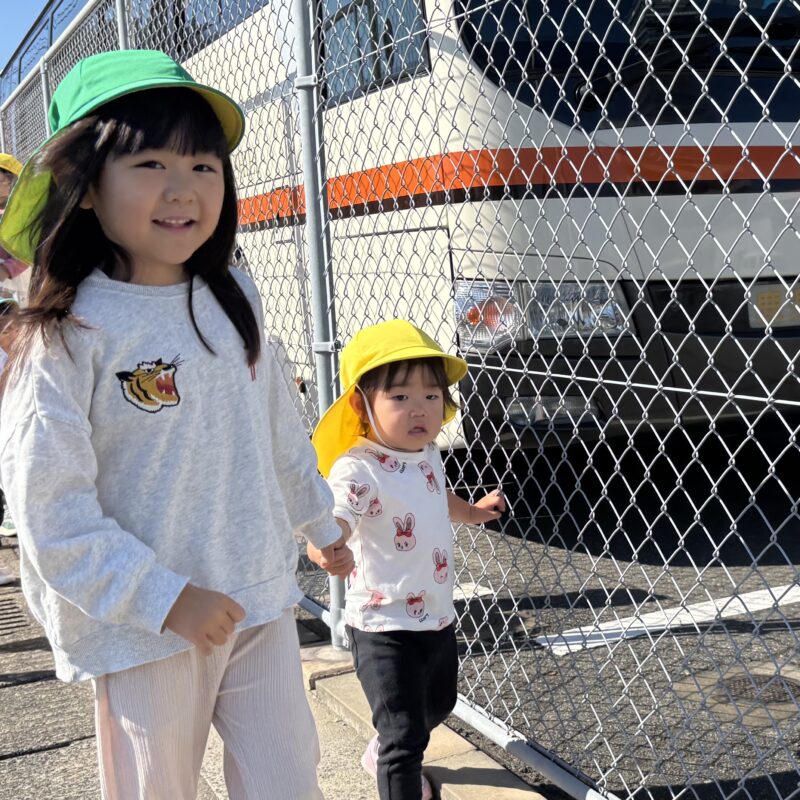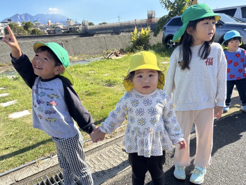 秋の澄んだ空の下、みんなで散歩に出かけました。年長さんに優しく手を引かれながら、ゆっくりと歩いていましたよ。