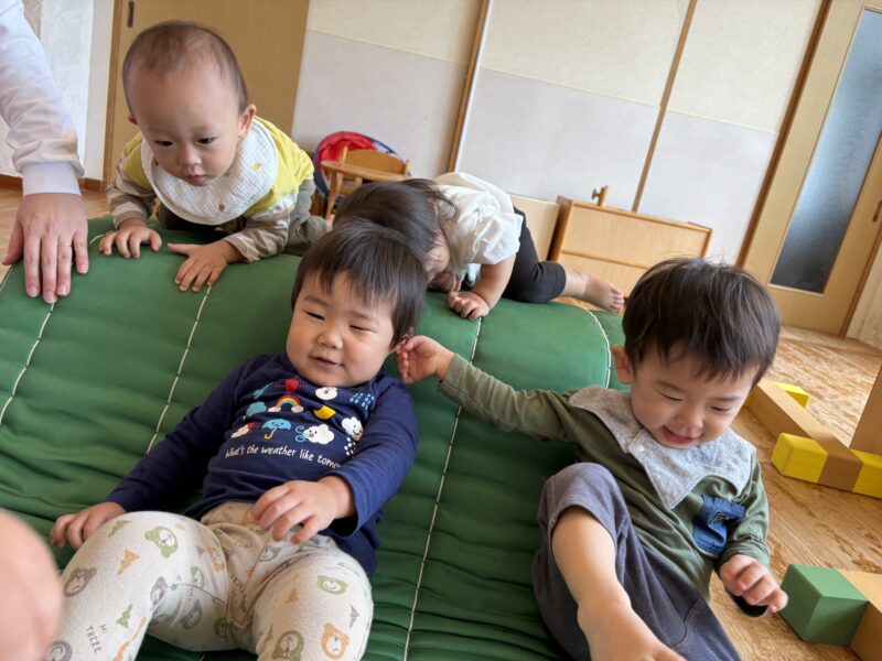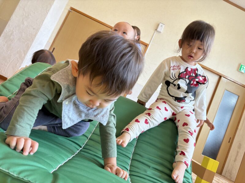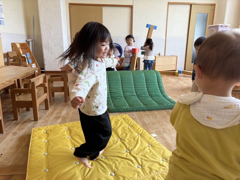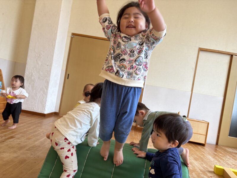 今、ゆず組の子どもたちが夢中になっているのはジャンプ遊び! ハラハラ・ドキドキを味わいながら、マットの山から勢いよくジャンプに挑戦しています。
