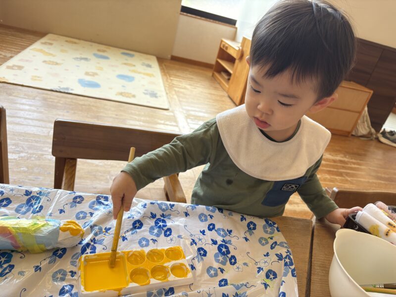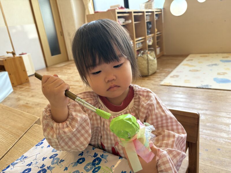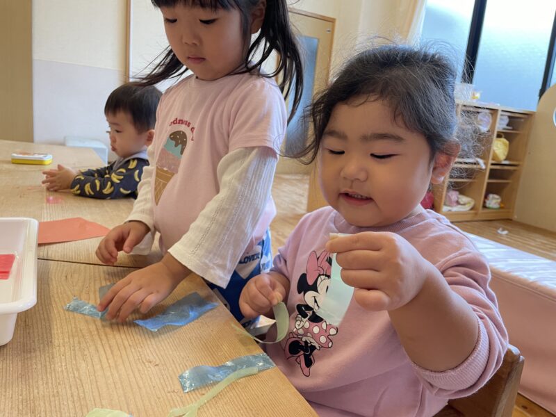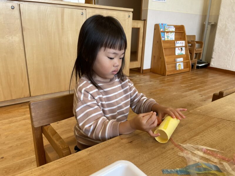 11月の製作では、ミノムシ作りに取り組みました。テープを裂いたり、筆で色を塗ったりしながら、それぞれの個性あふれるミノムシが完成しました。