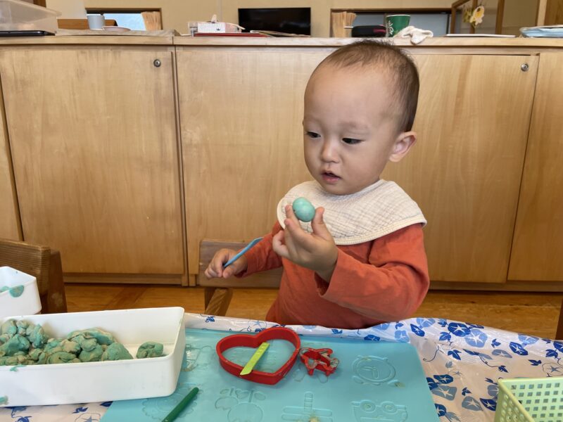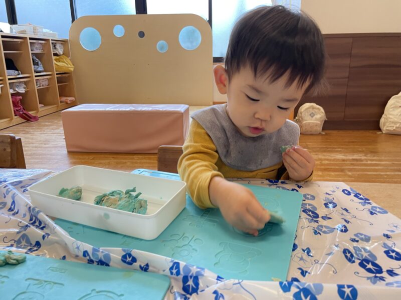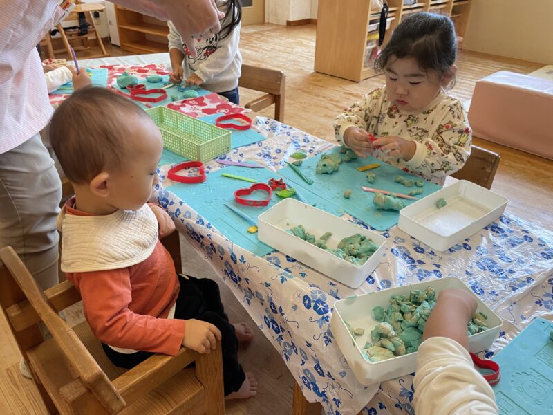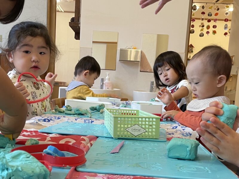 粘土遊びも、子どもたちが大好きな遊びのひとつです。指先を使ってちぎったり、手のひらで丸めたり、道具を使ったりしながら集中して取り組んでいました。