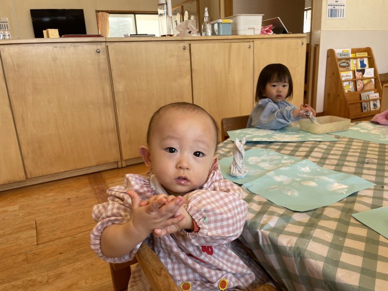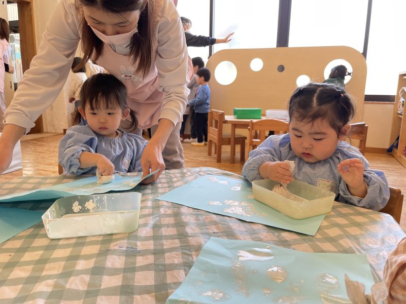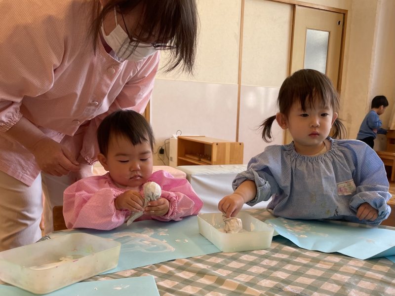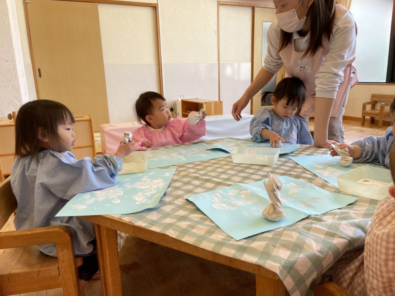 鯉のぼりの製作で、スタンプをして遊びました。「ぺったんぺったん」と声に出しながら、手の平にもスタンプしていました。