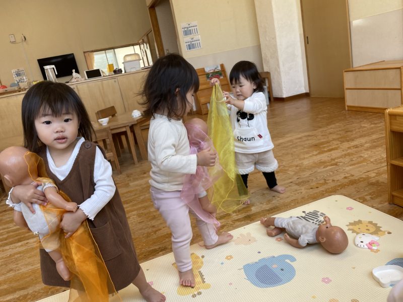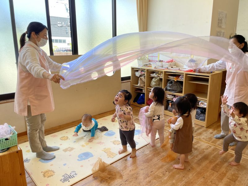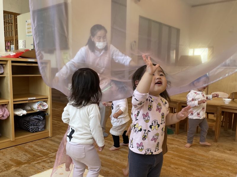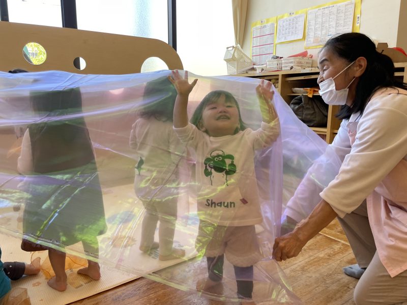 今回は、わらべうたに合わせて大きな布を使って遊びました。虹色の布が揺れるたびに、「わー!」「きゃー!」と大騒ぎでした。