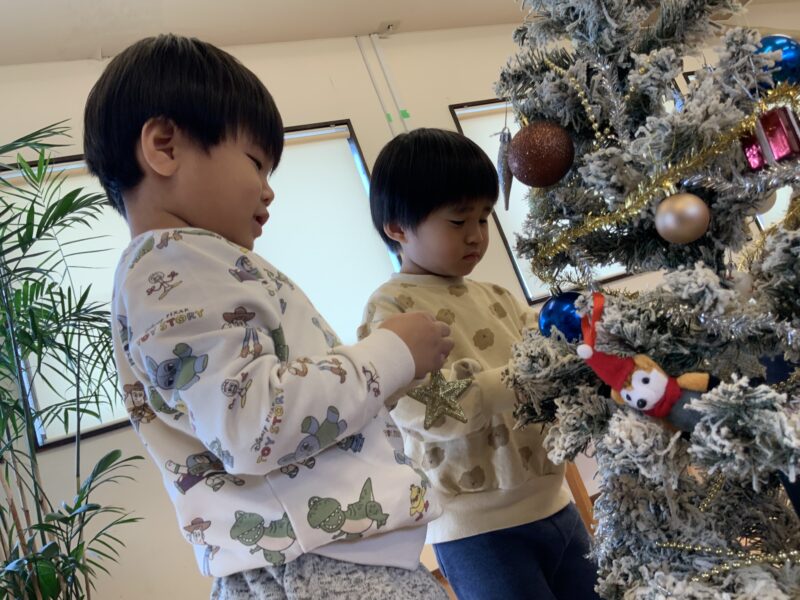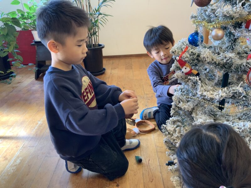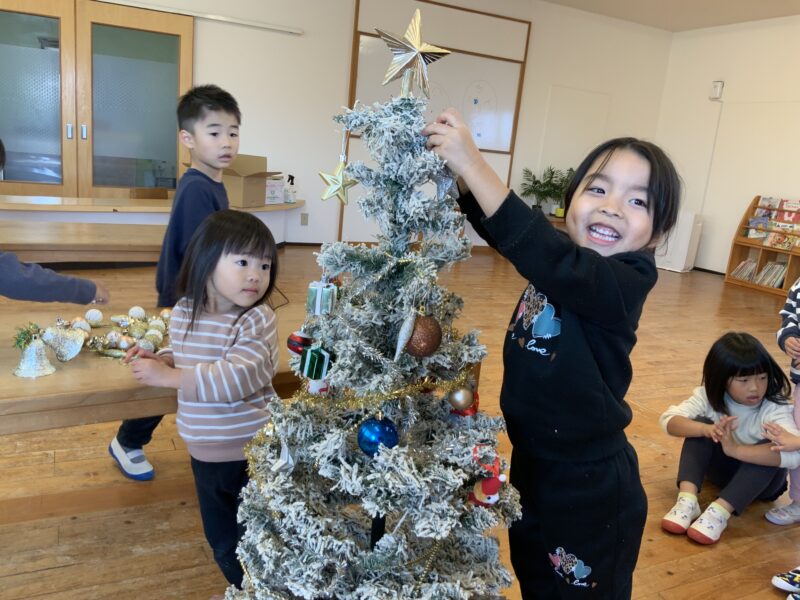 大きなクリスマスツリーに、みんなで飾り付けをしました。箱からツリーを出すと「おー!」と 拍手が起こり、大きな歓声も上がりました。「これを飾りたい」と、それぞれ好きな飾りを選び、思い思いに飾り付けを楽しみました♪