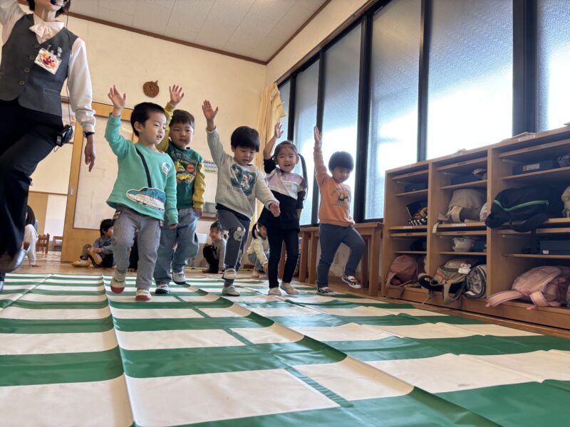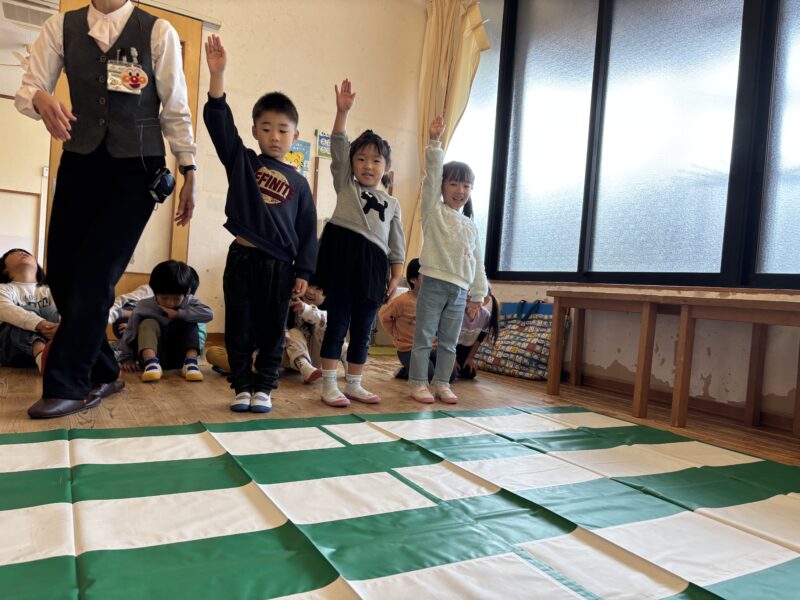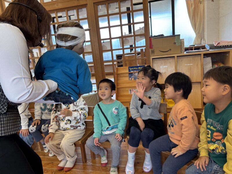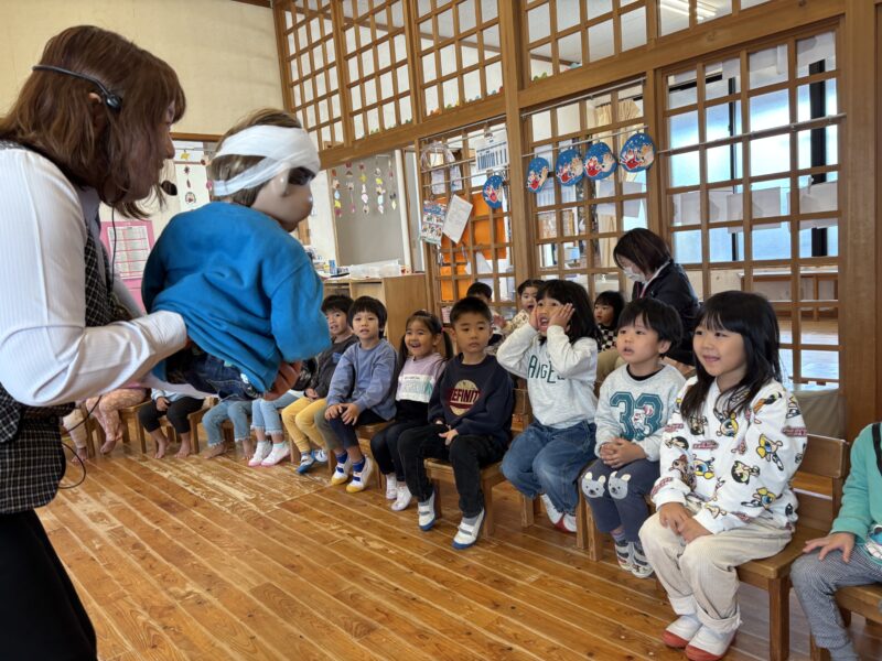 鹿児島市安心安全課の方に来ていただき、交通安全教室に参加しました。人形の『いちごちゃん』や『こうくん』と一緒に、道路での約束ごとを学んだり、横断歩道の渡り方を実践したりして、充実した時間となりました。