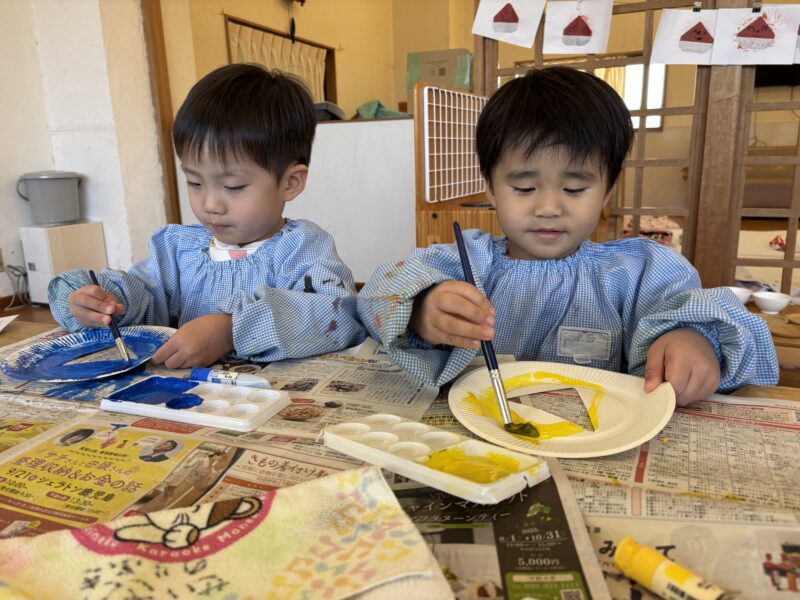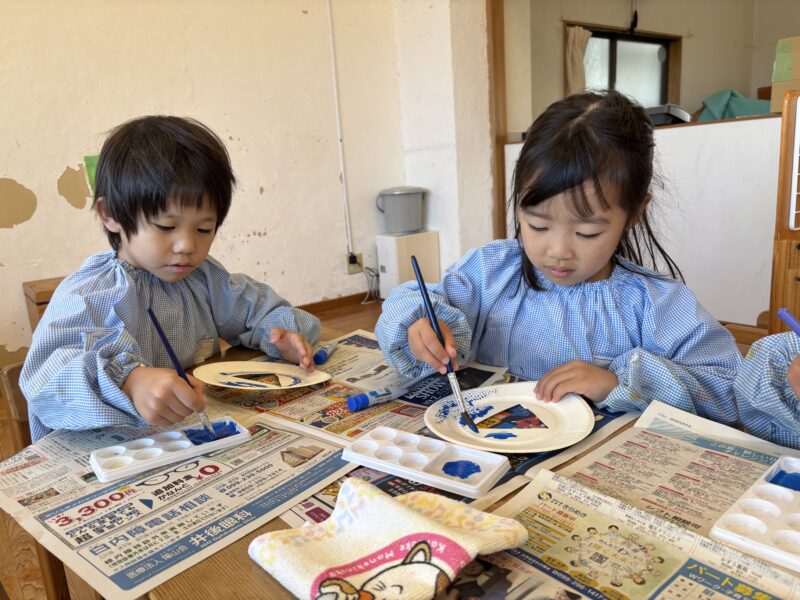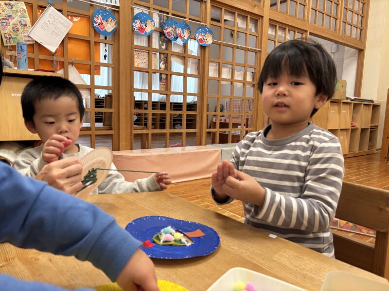 紙皿に絵の具で色を塗ったり、毛糸を使ったりしてクリスマスツリーを作りました。穴に毛糸を通す作業に少し苦戦しながらも、集中して取り組んでいました。最後にデコレーションボールで飾り付けをして完成です♪